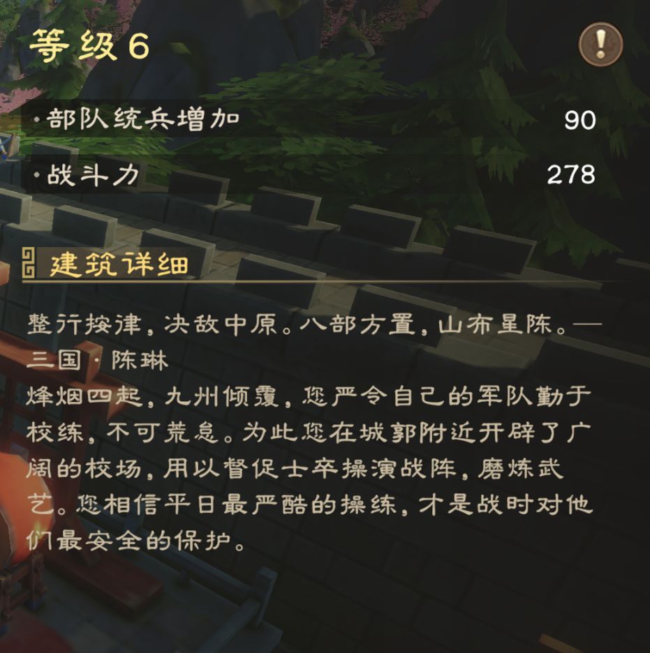 前期在跟主线升级建筑之余我们以提升霸府等级为主线,其次是提升校场等级,用于提升部队统兵数量,这个是非常重要的。