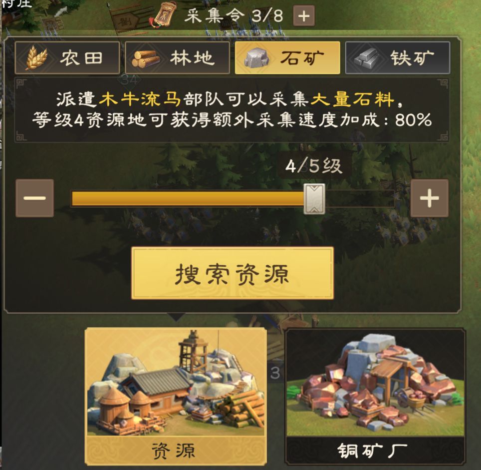 采集默认是1级资源,可以尝试有没有4、5级的资源,采集速度可以快一些,前期建议先采集石料,因为后面升级太学府研究科技会用到。