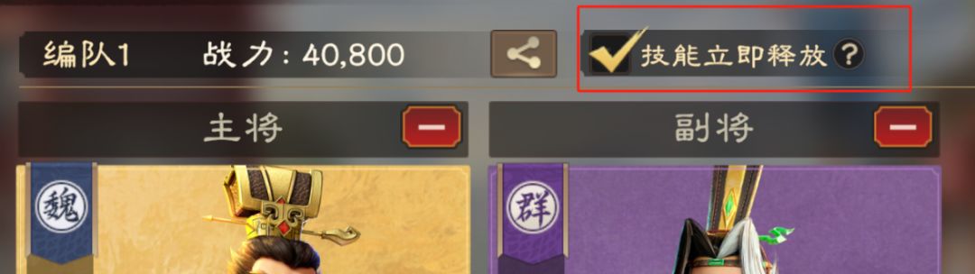 编队建议勾选“技能立即释放”选项,但部分武将组合手动释放技能有奇效,各位可以多做尝试。