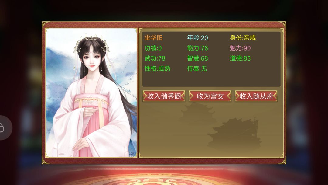 好啦,进入正题~在把皇子收到后宫我就想试一下,可以不可以探亲收到他国成员,万万没想到居然成功了!真的收到了一个大美女~