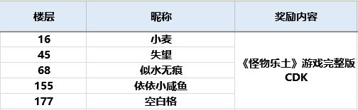 本次活动已开奖,恭喜以下小伙伴获得奖励~【已开奖】《怪物乐土》定档6月13日上线!参与活动赢游戏CDK