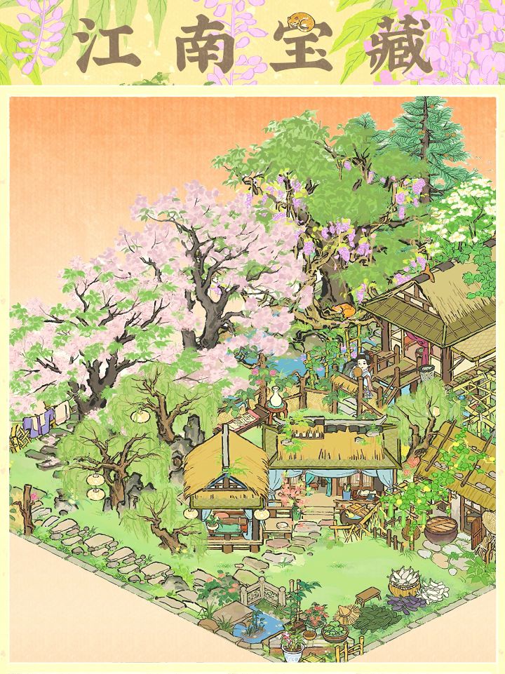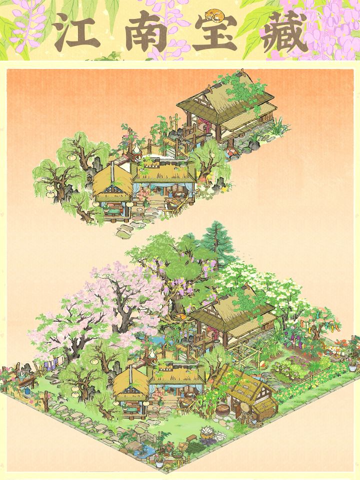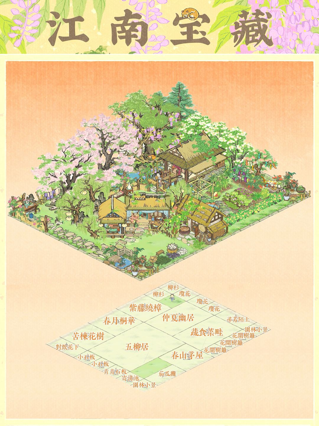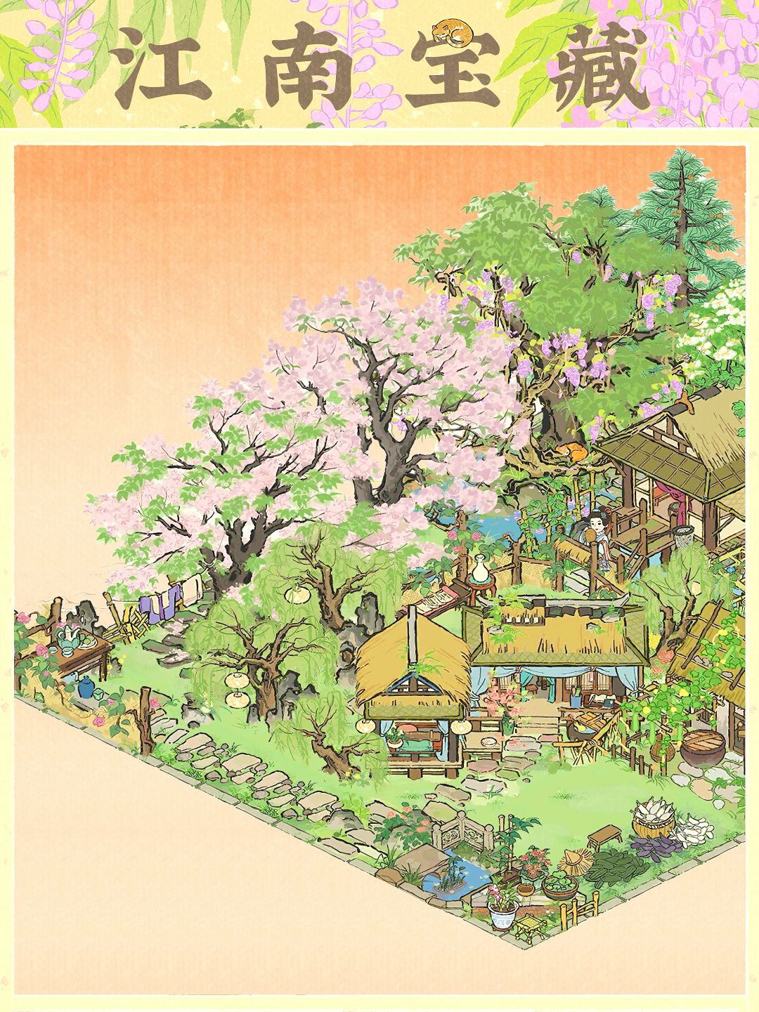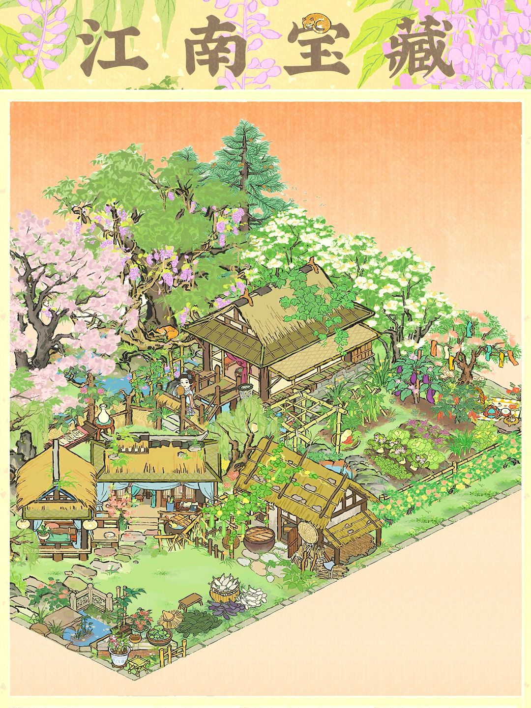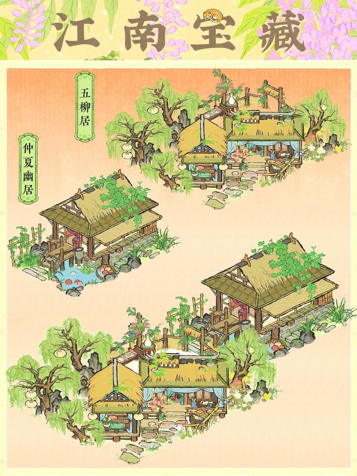 建筑:五柳居,仲夏幽居,苦楝花树,紫藤绕樟,春月桐华,蔬食菜畦,春山茅屋,对饮花下,茄瓜摊,园林小景,青青石板,寄清池,小石板