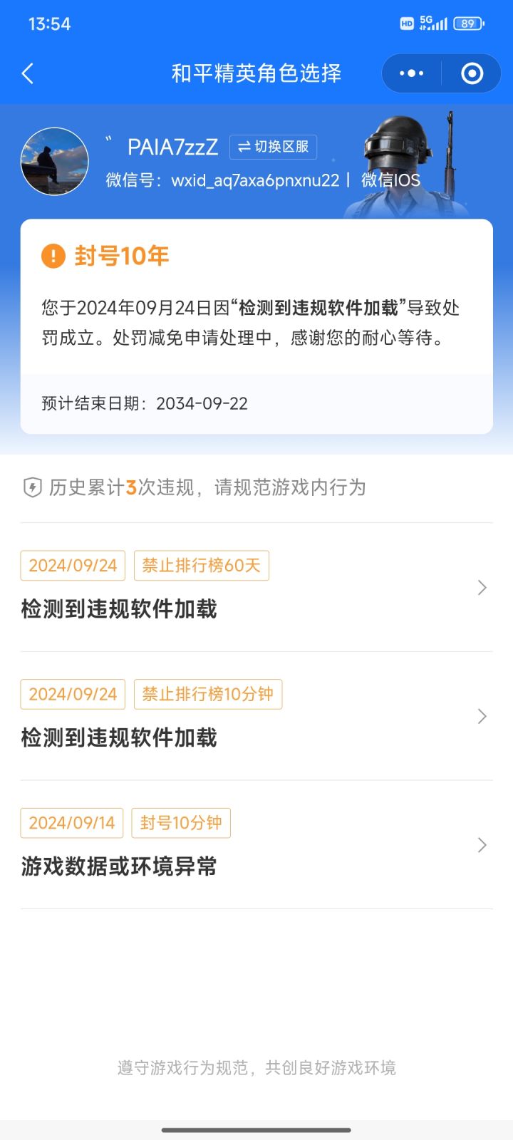 我的账号(ID: ゛PAIA7zzZ 编号:3547772009)于2024年9月24日被封禁10年,处罚理由为“违规软件加载”。游戏最后对局9月16日,经核查该封禁存在以下矛盾点,恳请人工复核: