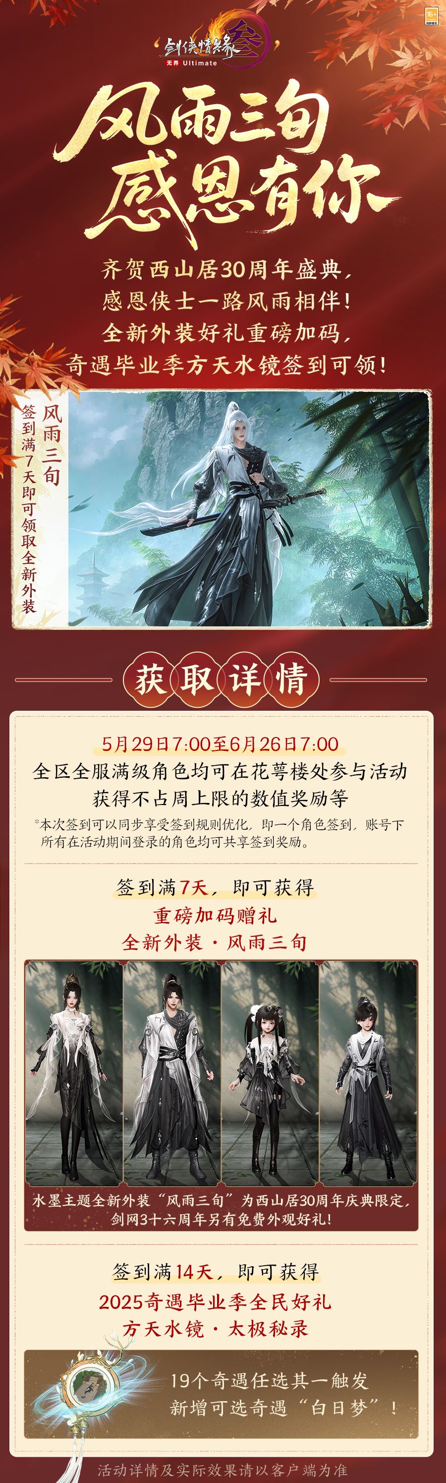 水墨主题纪念外装“风雨三旬”设计灵感来自西山居经典水墨动画水印,设计上注重利落剪裁,着重彰显侠者气质。风雨三旬,侠贯始终,本次纪念外装含布料效果及body3.0加持,签到7天即可领取,感谢侠士们一路的理解与支持!