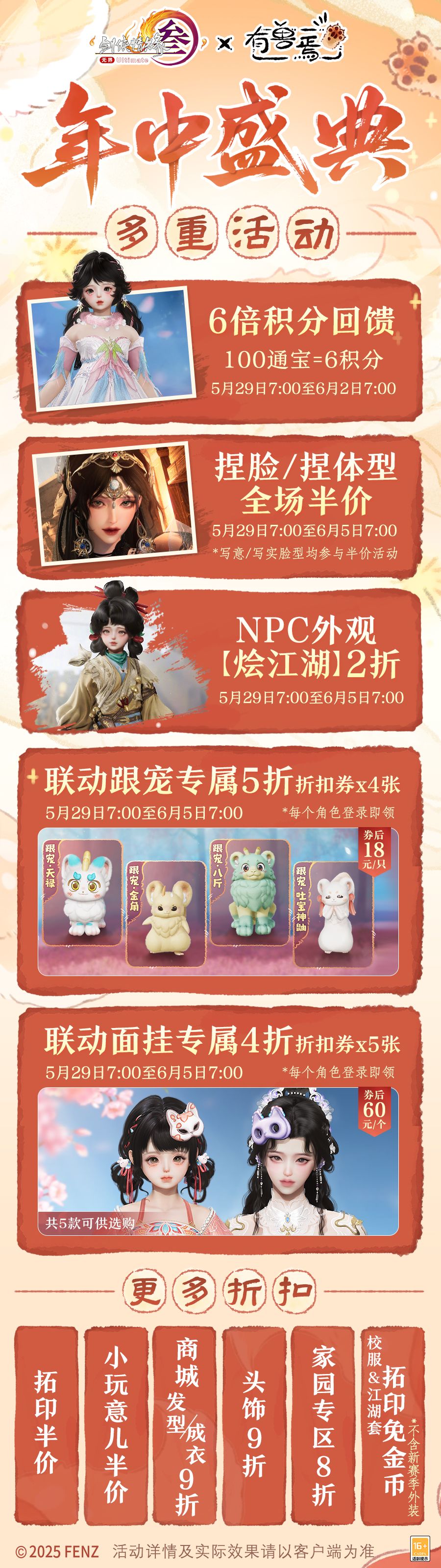 年中盛典特惠活动5月29日上线,多重折扣同步开启!6倍积分回馈惊喜来袭,捏脸、捏体型半价和拓印半价活动限时回归,初夏换新颜,解锁更多创意搭配!更有NPC外观、联动跟宠、联动面挂折扣助你乐享优惠,精彩夏日,与你相约!
