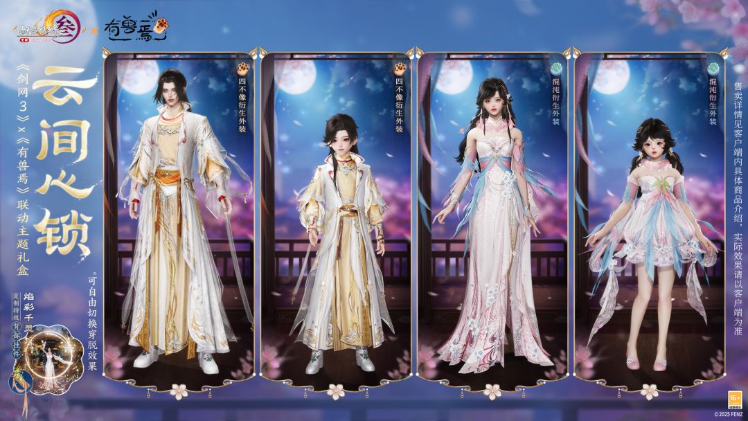 玄纹漫卷绣浮云,《剑网3》×《有兽焉》联动衍生外装礼盒“云间心锁”萌趣登场,礼盒基于“四不像”和“混沌”两只神兽形象衍生而来,软萌绒饰再辅以云纹绣样元素,结合神兽独有的绚丽色彩,童趣与优雅兼具!男款罩纱与女款绒领皆可自由切换穿脱,万变随心!