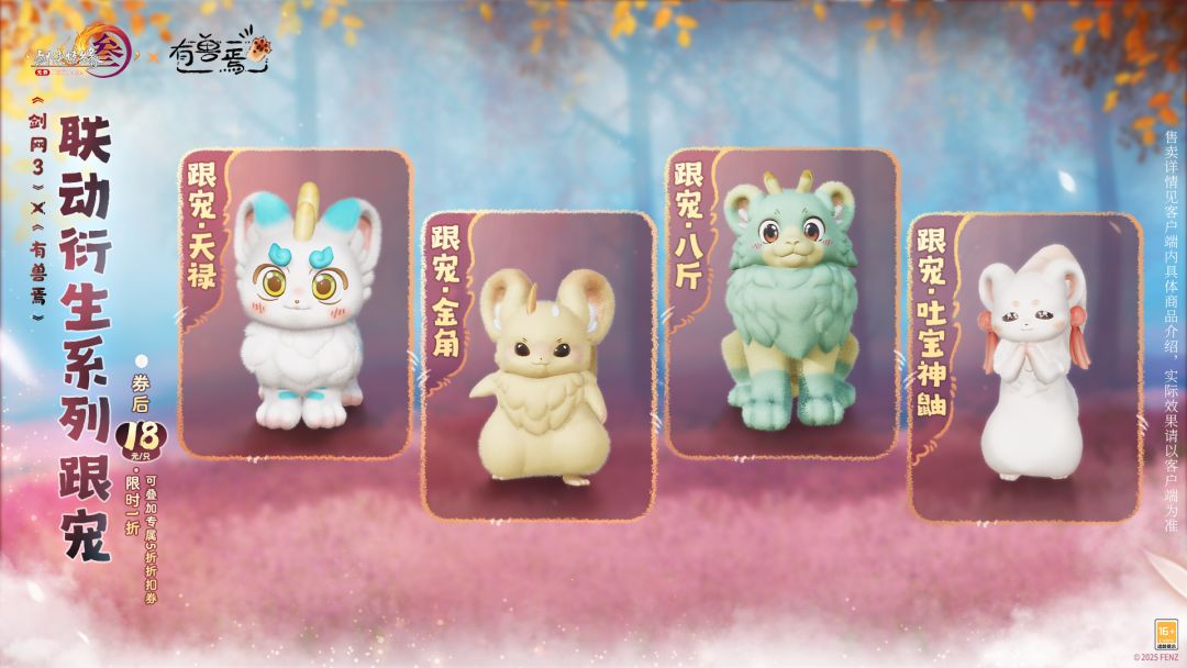 神兽出击,超萌来袭,《剑网3》×《有兽焉》联动衍生系列跟宠折后只需18元/只!5月29日7:00至6月5日7:00期间,每个角色登录即可领取4份联动跟宠专属5折折扣券,叠加上限时1折活动,不容错过!