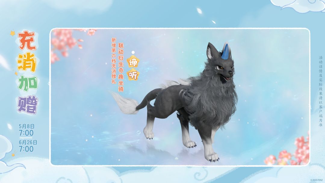 驰骋江湖,超威风的“谛听”神兽与你相伴!5月8日7:00至6月26日7:00活动期间,侠士在全区全服充值时间及消耗通宝金额累积总和≥360元,即可领取联动衍生奇趣坐骑“谛听”!