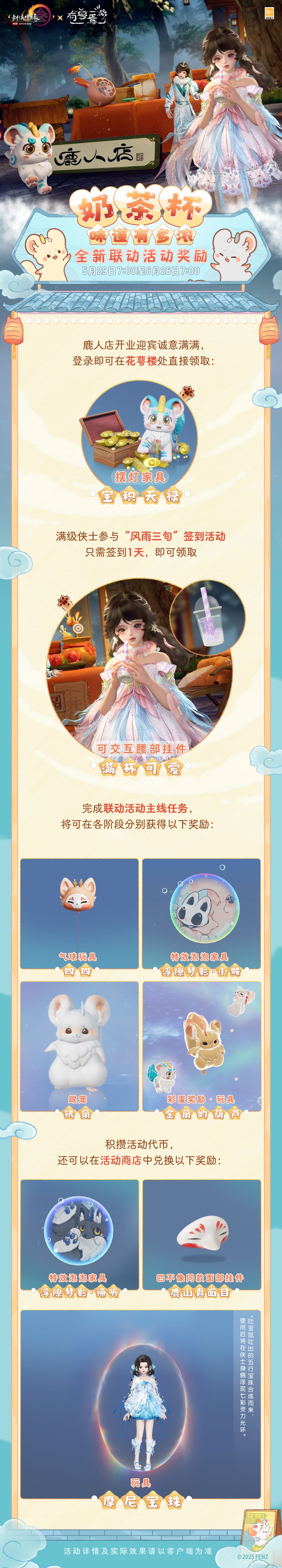 联动惊喜好礼大放送,上线就有连环惊喜!登录即可在花萼楼直接领取摆灯家具【宝积天禄】,参与签到第1天就能直接拿下超可爱的可交互腰部挂件【满杯可爱】!这杯奶茶的味道怎么样?尝一口试试看吧!