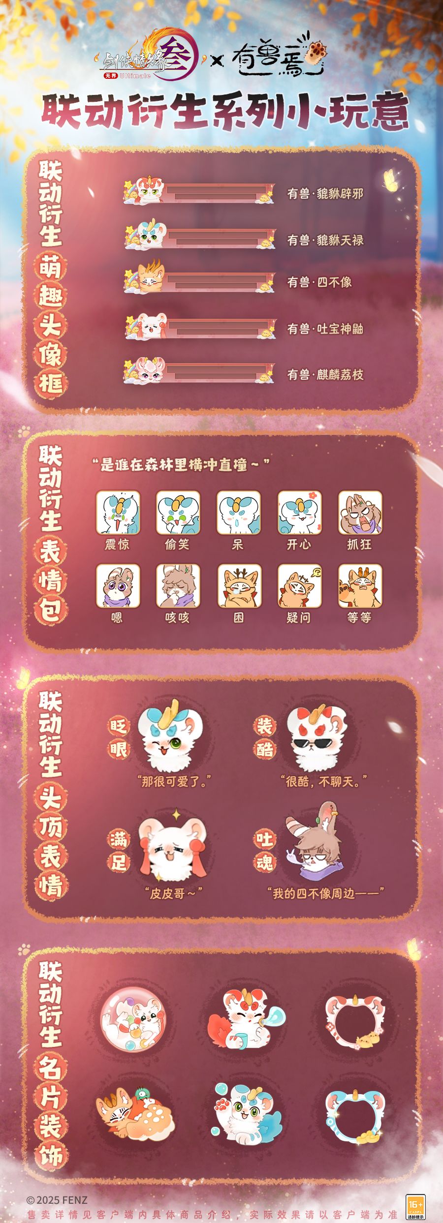 神兽们性格不同,看他们嬉闹也很有意思!《剑网3》×《有兽焉》联动衍生系列萌趣头像框、表情包、头顶表情等小玩意采用神兽本体形象,让它们“替你发言”!记录每个和它们同频共振的心情,让生活的每个角落都“有兽来焉”!