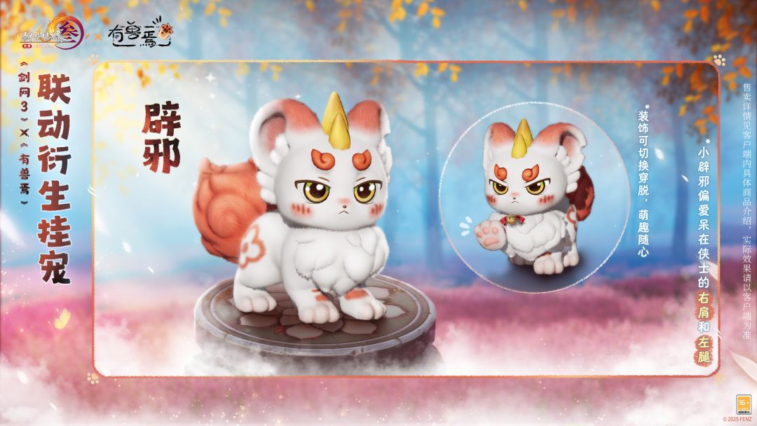 一身蓬松柔软的绒毛,让人忍不住想揉进怀里!《剑网3》×《有兽焉》联动衍生挂宠“辟邪”稳重可靠,但又可爱非常,偏爱呆在侠士的左腿和右肩。金色眼眸清澈透亮,搭配头顶标志性的小角,谁能拒绝虽然爱冷脸但超会护短的貔貅哥哥!