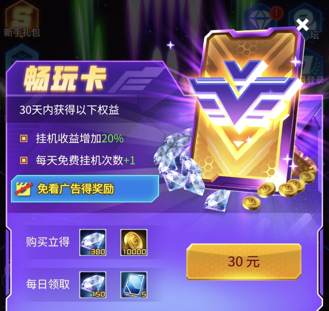 新手礼包给异形本体一个,可以考虑拿下,畅玩卡最主要有免广告和钻石,长期玩可以一直买,能节约很多时间,最后是基金,可以看情况购买