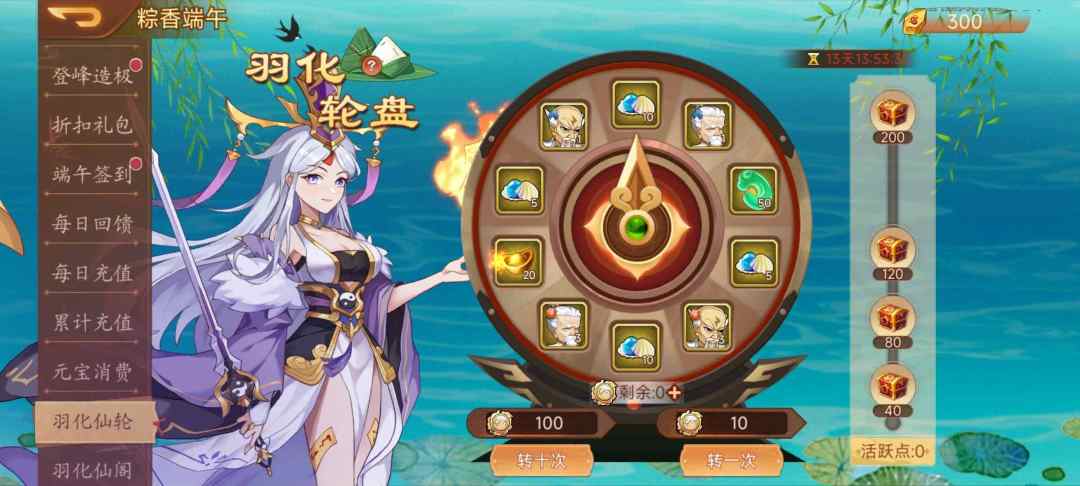 活动内容:活动期间使用“六壬式盘”可以转动羽化仙轮,仙轮概率掉落蓝珍珠、于吉仙魂、于吉资石、水镜仙魂、水镜资石等道具。蓝珍珠可于羽化仙阁兑换奖励。
