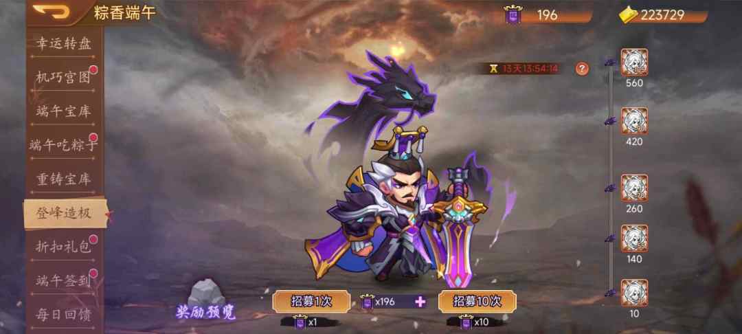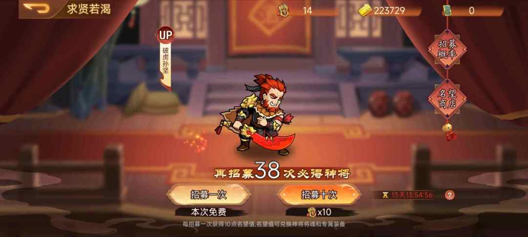 活动内容:活动期间,可通过消耗招募令进行招募武将,up武将的概率会高于其他同档位武将(每期活动会更换up武将),每次招募可获得10名望,名望可在名望商店兑换道具。