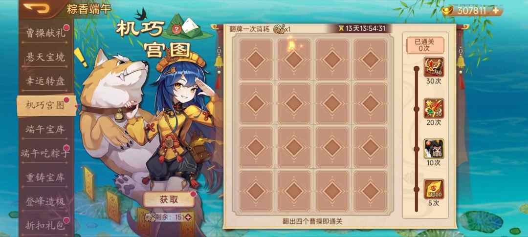 活动内容:活动期间,可通过消耗机关钥匙进行翻牌,翻到4个曹操即可进入下一关卡,通关关卡次数达到目标值即可获得奖励。