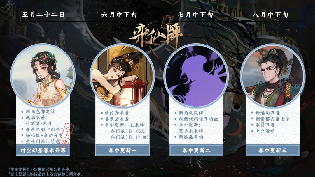 道友们好,欢迎查看本赛季的更新路线图。本赛季将陆续添加新的未来牌,也会不定期地追加新的幻景事件,为道友们在对局时带来惊喜。
