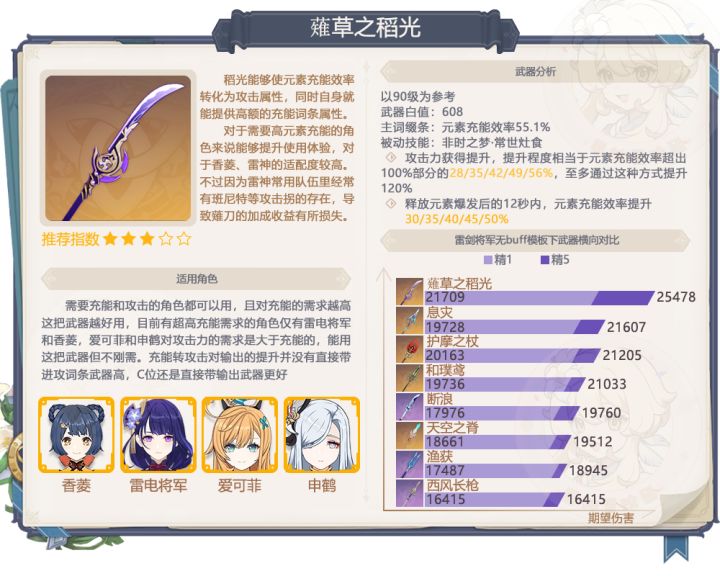2、薙草之稻光抽取建议:蕛刀能提供高额的充能和充能转攻击,看似泛用,但其实只有香菱和雷神完美契合;爱可菲和申鹤也能用,而且相比四星武器的提升也不小,但二人都不需要特别高的充能效率,导致武器的整体收益不值得专门投入一金的成本,非要给配一把五星武器的话不如抽专武来的实在,非XP不建议抽