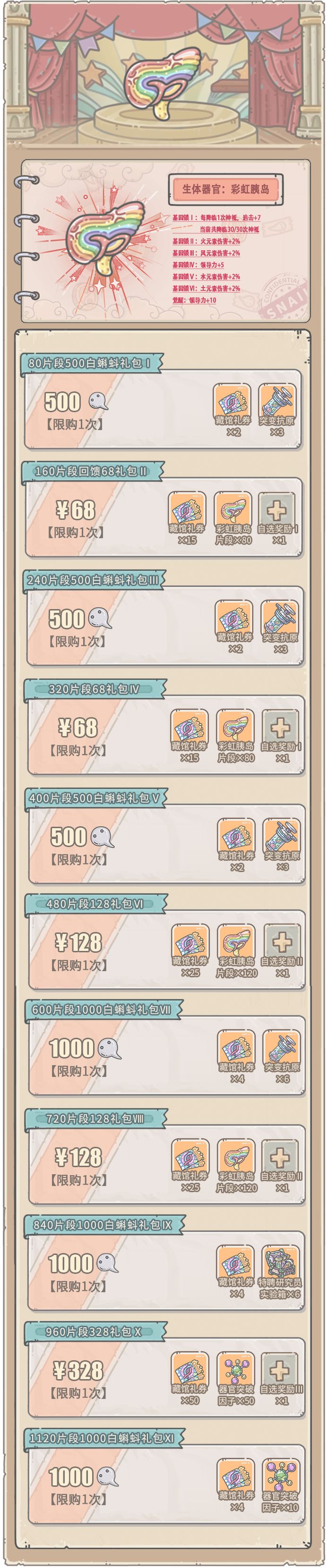 2.根据获得的对应器官片段数量,可领取新的免费奖励,并解锁新的礼包