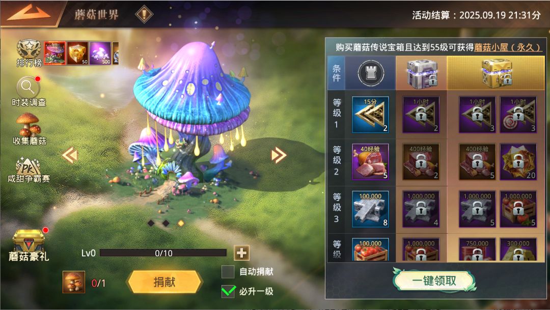 2)战令每级均有专属奖励,解锁蘑菇战令宝箱更可额外获得海量养成材料及限定装饰,包含【蘑菇小屋基地皮肤】、【蘑菇城墙】等稀有道具