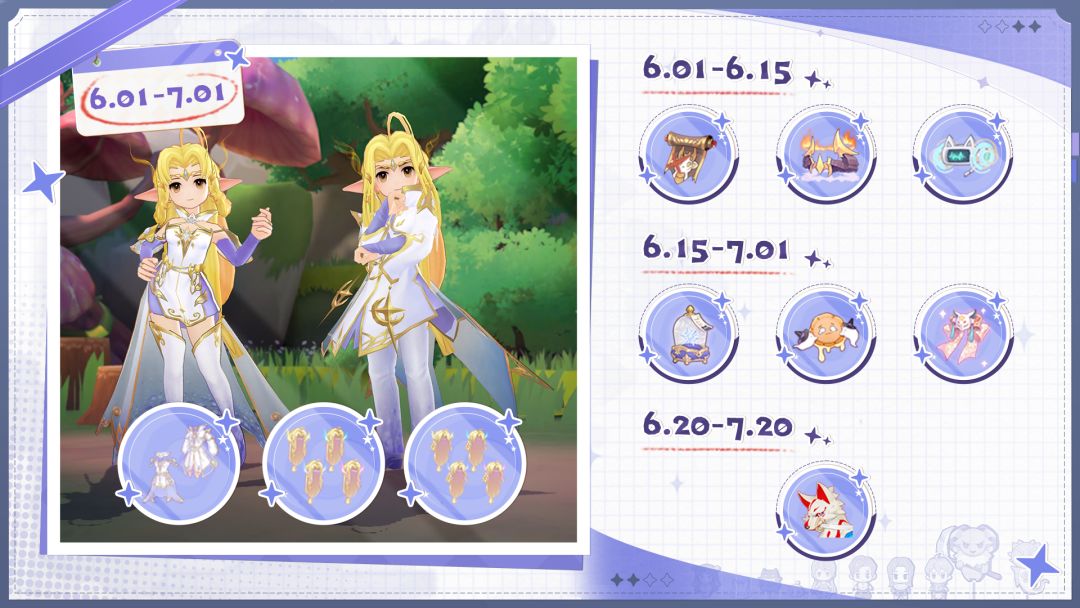 活动期间,「童趣冒险录」开启,通过完成「童趣夏日」中的各项活动,可以获得「童趣冒险录经验」提升「童趣冒险录」的等级,领取各类稀有奖励。
