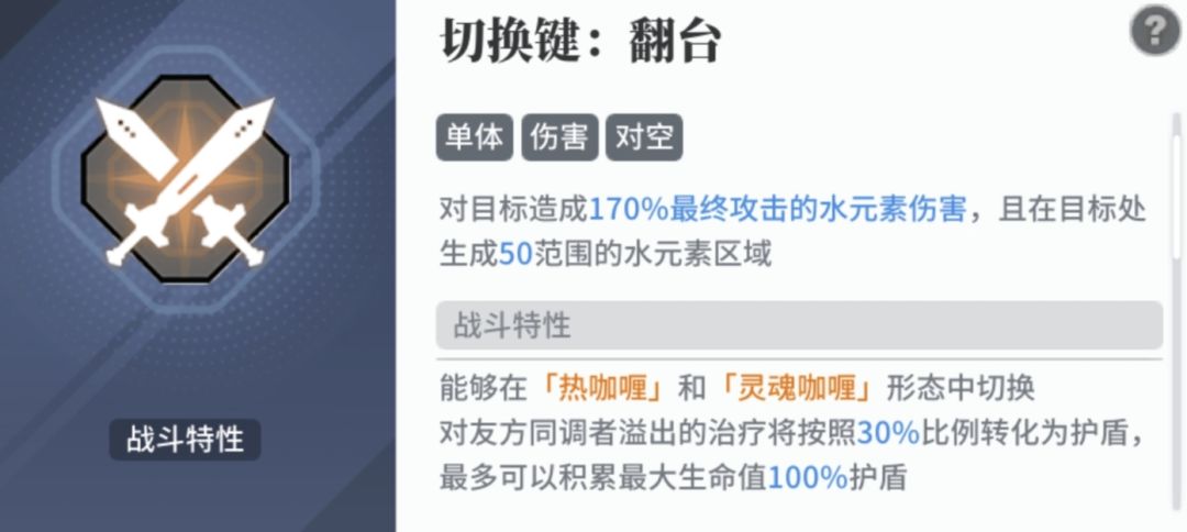 主动技能一:进入灵魂咖喱形态,回复主动技能二的次数,造成更高伤害,无法铺水。