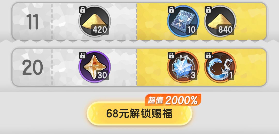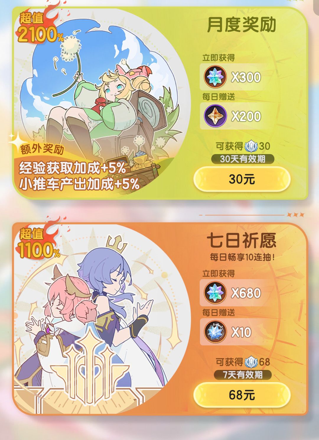 月卡:增加人物经验+小推车产出加成,每日还送石头,颇具性价比,比较推荐