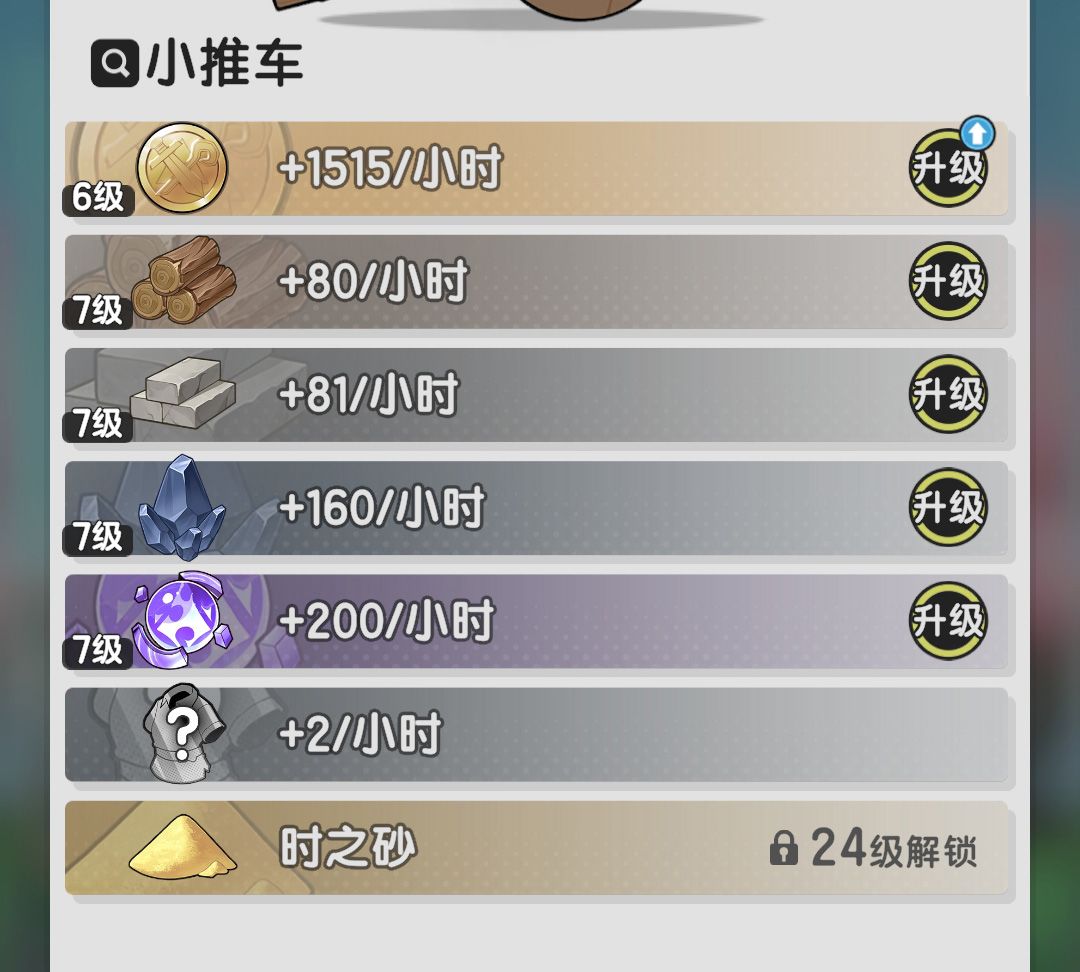升级优先级:历战精华=粗练石>石块=木材>罗拉>装备>时之砂