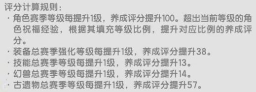 主要计算:角色等级、装备等级、技能等级、幻兽等级、古遗物等级。超出上限越多,评分越高。