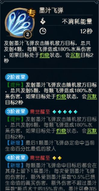 发射墨汁飞弹攻击随机敌方目标,总共发射4颗,每颗飞弹造成180%水系伤害如果目标处于灼烧状态,会沉默目标2秒