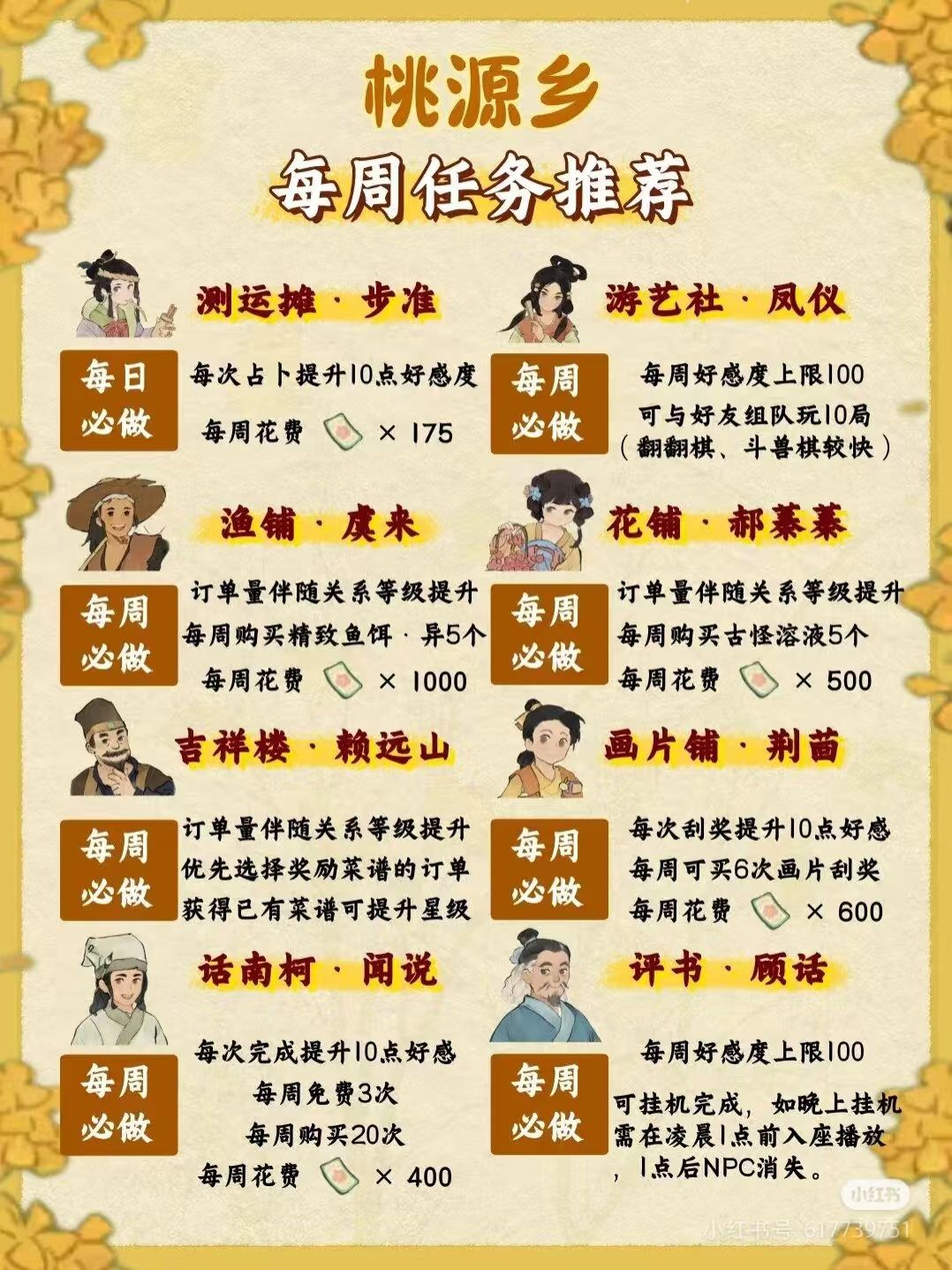 新手阶段,上图的桃源乡周常也未必要全做。