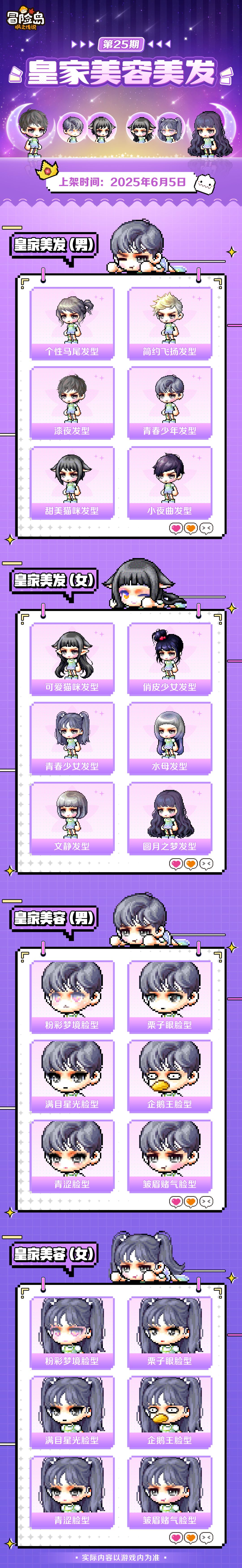 本期上新「个性马尾发型」、「青春少年发型」、「可爱猫咪发型」与「粉彩梦境脸型」、「满目星光脸型」等超多款少年少女发型脸型,冒险家们快来体验从头美到脸的快乐吧!