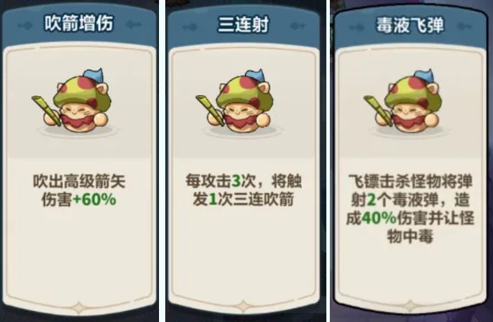 蘑菇头作为次输出伤害,强化词条选择【增伤】【攻击次数增加】【毒液飞弹】,提高吹箭攻击伤害和攻击速度,引爆更多毒蘑菇。