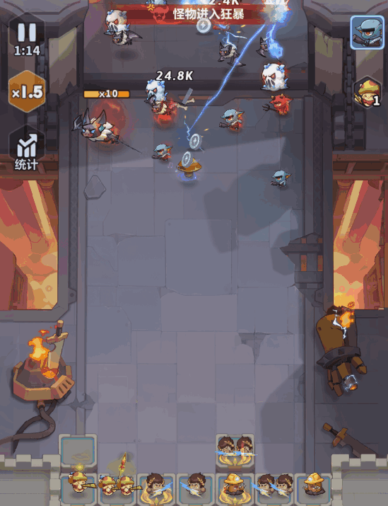 17关中怪物类型较多,需要注意阵容的搭配。哥布林、火焰哥布林和蝙蝠移速快,会面临一同压近城墙的危险。精英巨型蝙蝠移动速度快,血量厚,需要及时清理。