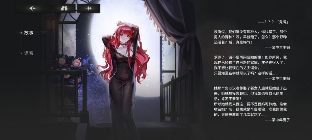 对鬼王而言,她和鬼牌的其他成员是合作关系,成员们都是看透了这个世界本质的人。但真要我来说,她们最大的共同点好像都是家破人亡才对……鬼王貌似来自于多年前一个足以左右多国政治的商人世家。这家人被幸运女神眷顾,在战乱中起家认识了各国的“贵人”,逐渐构建起了庞大的商业帝国,然而商人终究是商人,无法顺应强权,结局自然只能被抹除。好在天无绝人之路,这家人在最后关头成功抢救了大批财产,保留最后的火种消失在了深渊,这大概也是为什么鬼王可以毫无顾忌地花钱吧。毕竟富有到这种程度,即便坐吃山空也是正常人几百辈子也花不完的财富。