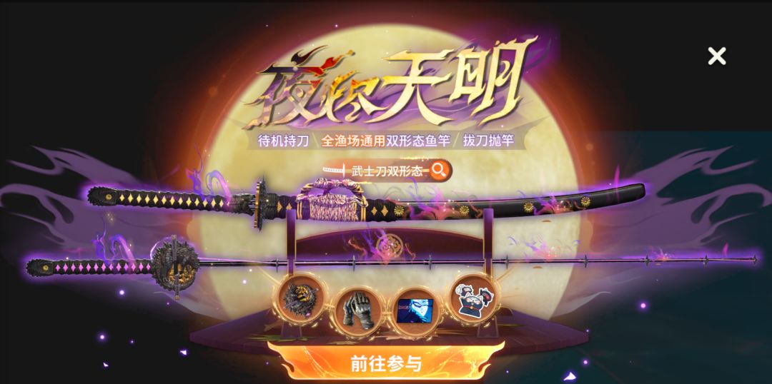 活动奖励:超人气全渔场通用双形态鱼竿皮肤「夜烬天明」限时返场,武士刀-鱼竿双形态丝滑切换,待机持刀-拔刀挥竿燃爆全场!还有限定手套机车武士伴您激情战斗至最后一刻!以及限定主题表情包、头像、头像框等丰富奖励等你来拿!