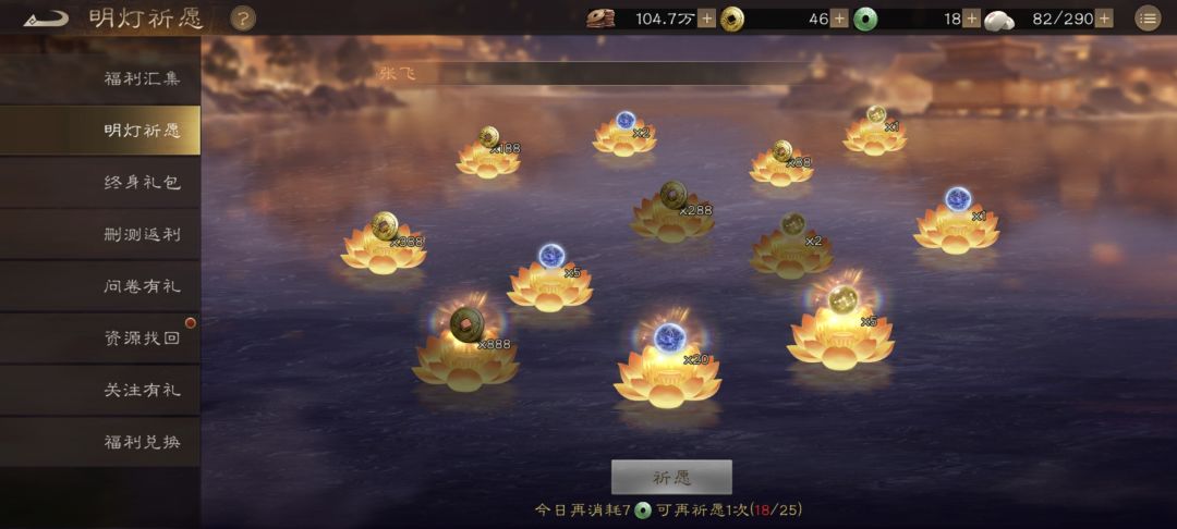 当游戏货币消费到一定数值,可以触发明灯祈愿。