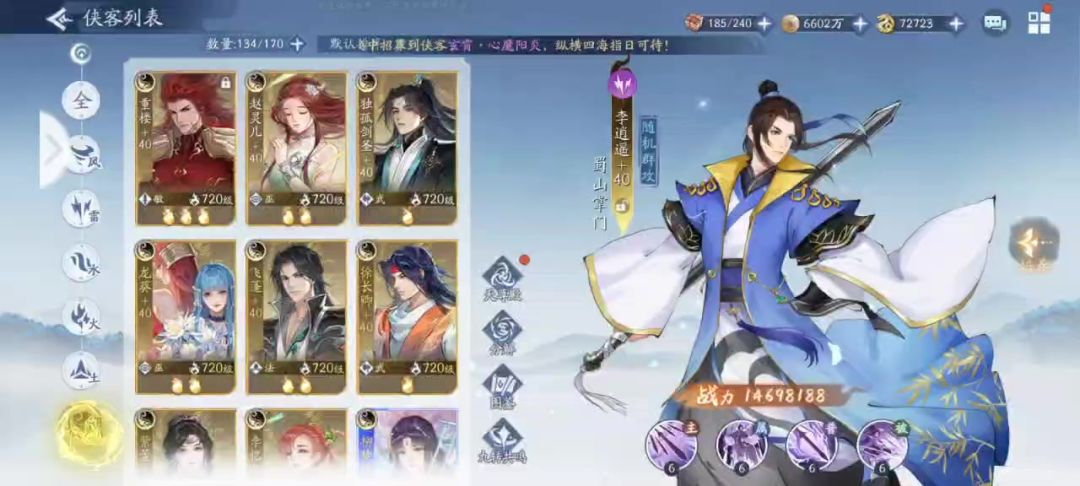 点评:属于水系温慧行觞状态的进阶版,水系温慧的行觞状态,描述为:友方侠客阵亡时,自身获得阵亡侠客的剩余怒气,而该技能等级描述,直接进阶为,为全体侠客回怒,为友方提供稳定怒攻做出了保障