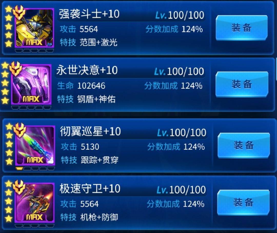 强袭斗士是最容易获取的战力最高的战机,永世极意可以用来打后期的深空巡航,彻翼寻星因为有贯穿,所以整体伤害很高,极速守卫可以挡子弹,方便通关。