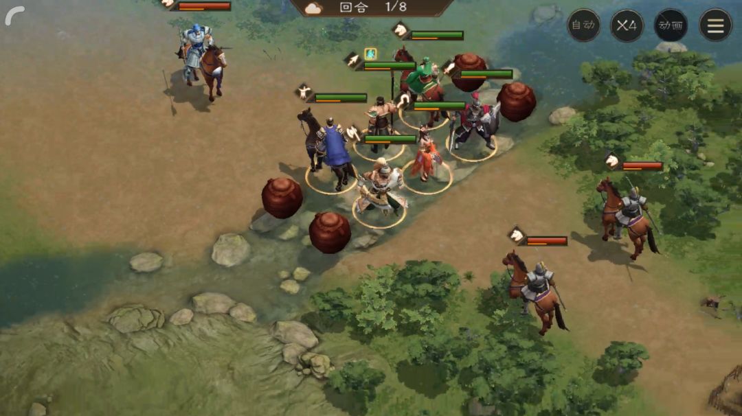 第一回合:全体往回走打2个骑兵,曹操负责加光环,其他人走位,让徐晃稍后跑到浅滩而且占着火药桶旁边