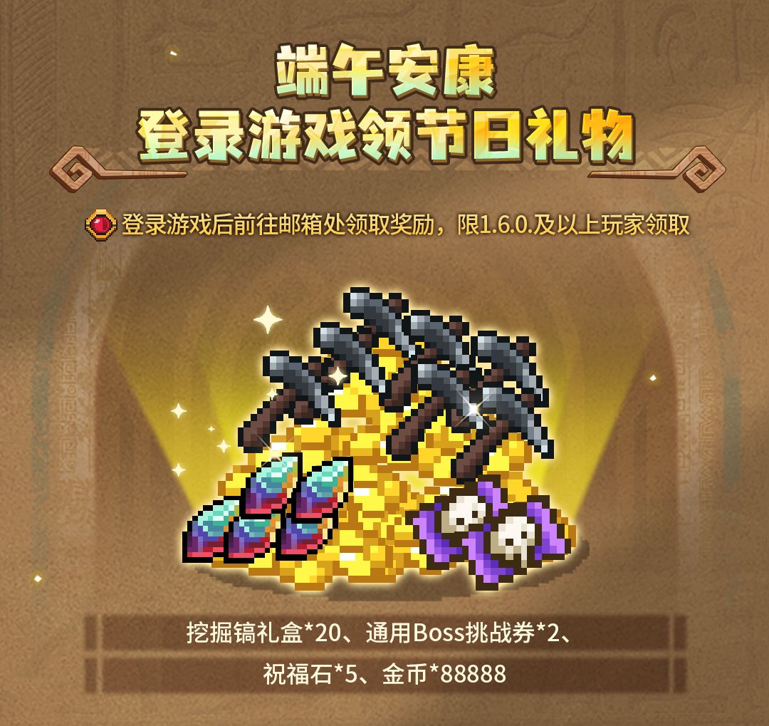 挖掘镐礼盒*5、通用Boss挑战券*2、祝福石*5、金币*88888