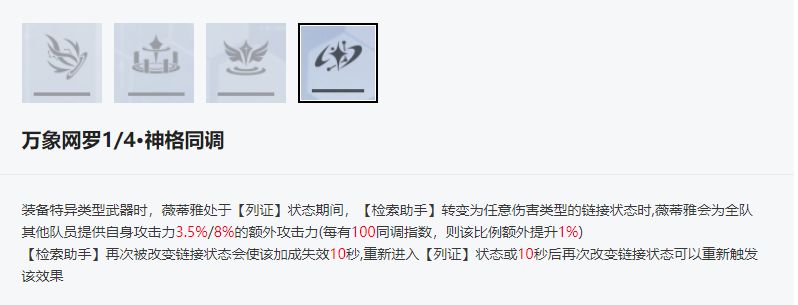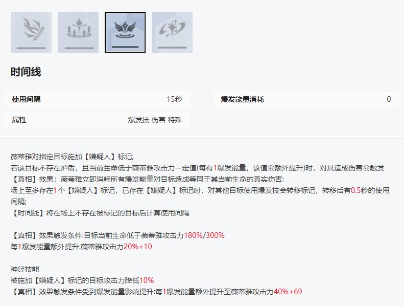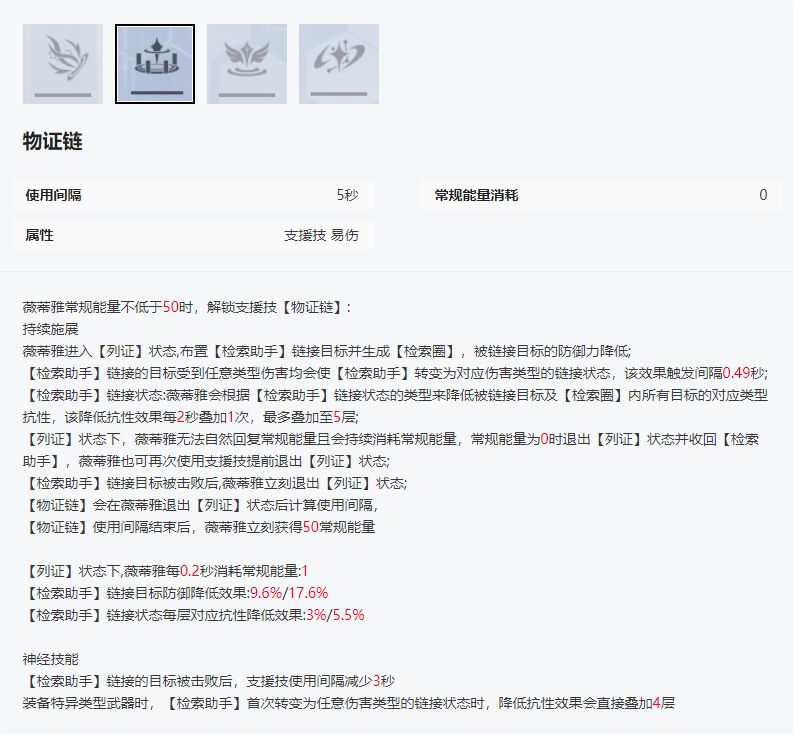 核心技能,薇蒂雅会上场锁定单体敌人,提供降防和降低属性抗性,属抗类型会根据你造成的伤害来变化。该效果会保持锁定在单体敌人身上,因此不怕各种任何无敌效果。装备5星专武的情况下该效果可以永久持续直到目标死亡。减抗效果对所有圈内的敌人都会触发,减防只对单体触发。由于每0.49秒会判定减抗的类型,因此在选择其他会造成伤害的辅助时最好和主C保持属性一致,防止减抗被更改。效果结束后才会计算cd,但是cd转好就会回满能量,因此即使没有专武覆盖率也很高,不需要担心。