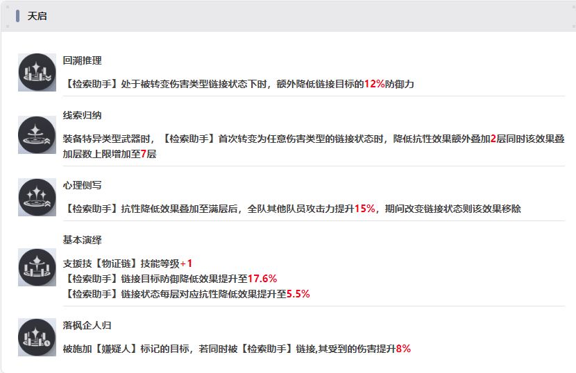 天启1 2是增加减抗的数值,考虑到她的高泛用性可以把她提到2天启。没有更多机制相关内容还是非常好的,培养难度不高。同时也保证了即使是0天启也能完美使用。