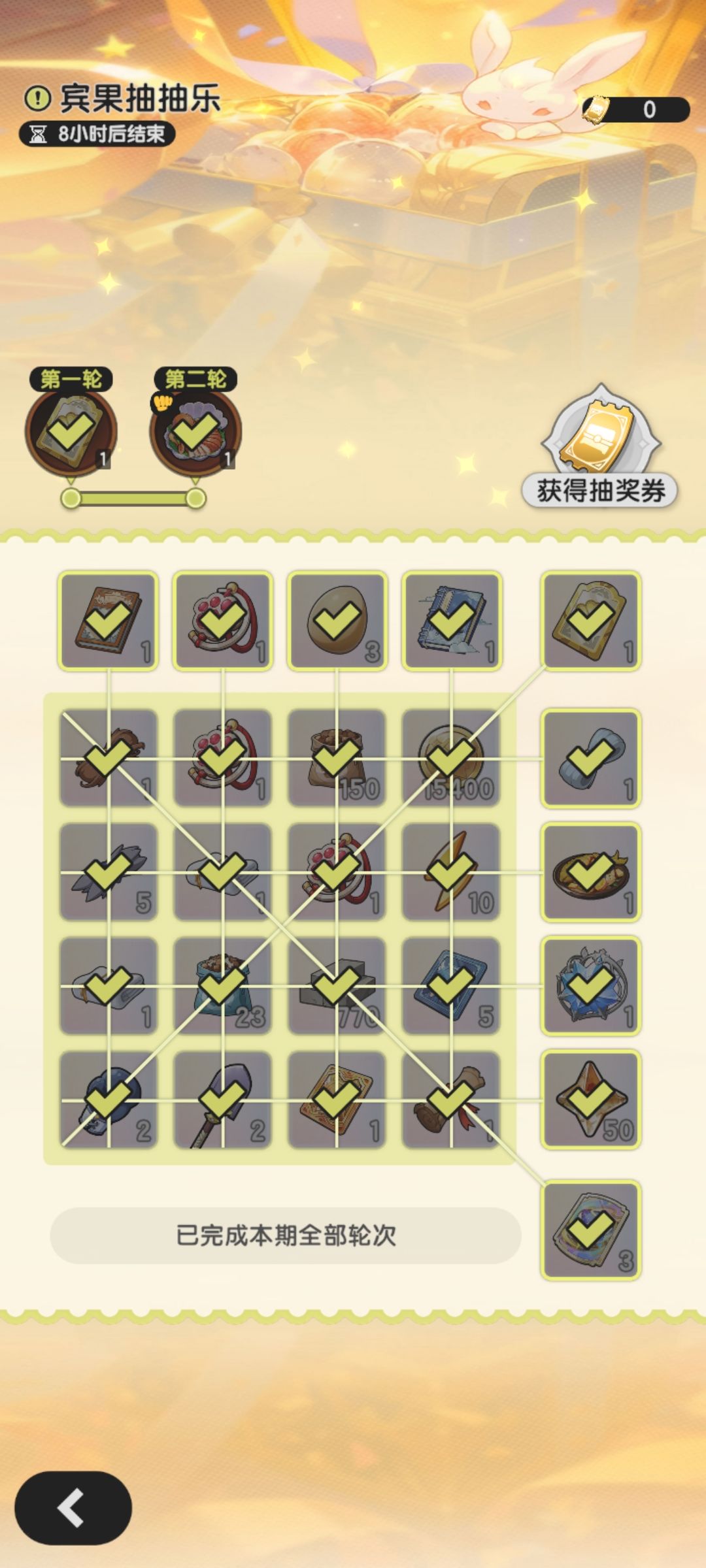 宾果抽抽乐活动持续一周,活动期间完成每日活动任务可以获得宾果抽奖券。消耗抽奖券可以抽取当前奖池内随机一格的奖励,当已获得的奖励格在横向竖向或斜向上五个连成一条线时,可以解锁对应的连线奖励。完成一整轮抽奖后,可以额外获得对应轮次的完成奖励。活动期间获得的抽奖券只可在本次活动内使用,无法继承至下期抽抽乐活动。