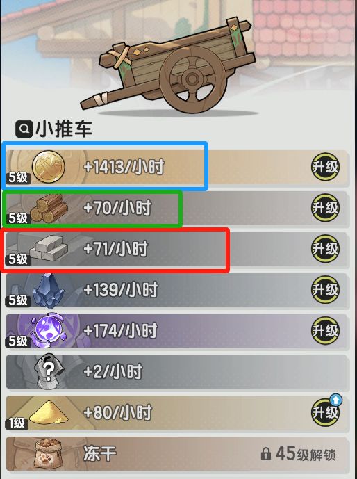 小推车随便升会导致落后进度,建议先升石材、钱和木材的,尤其是石材缺口巨大