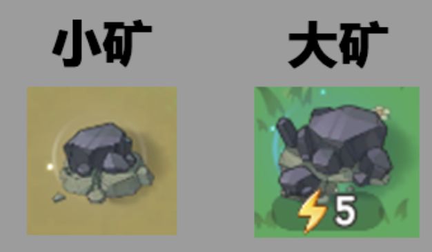 大矿和小矿相比有明显的区别,建模会比较大,还会散发蓝色特效光,同样都是消耗5体力采集,因为大的是随机刷新,但必须要采集完小的才有位置让它刷新出来