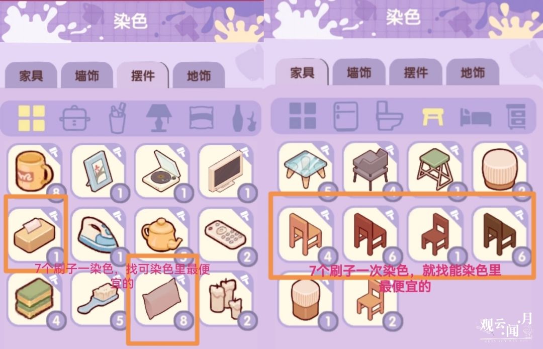 我目前发现的最便宜的染色就是摆件抽纸盒、抱枕和家具椅子(具体样式看图,不要找错啦),这样25次染色仅需175个刷子,耗材比较
