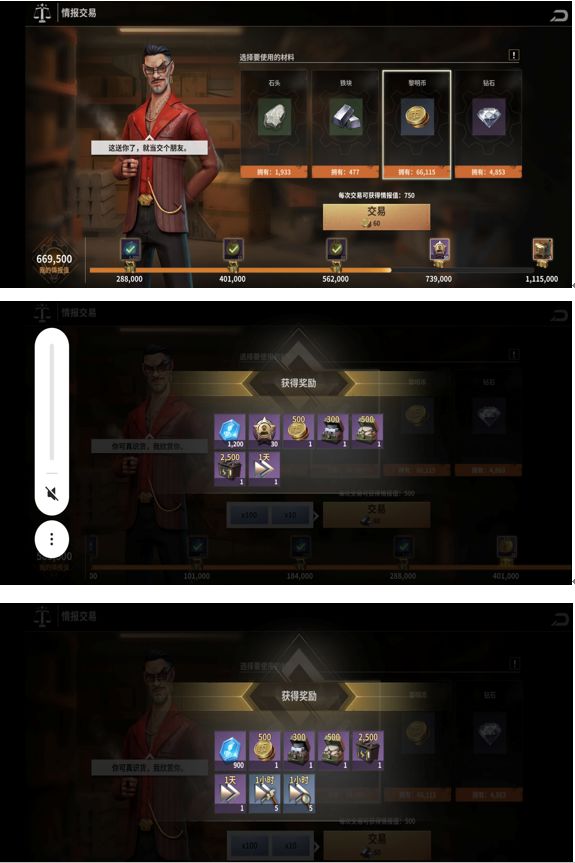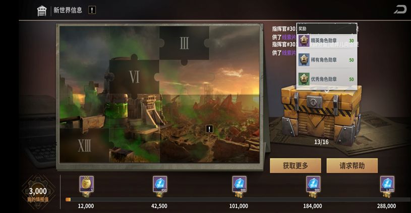 使用各类基础资源换取情报值,情报值越多,可领取的宝箱越多,最高档位箱子解锁需要115万情报值。