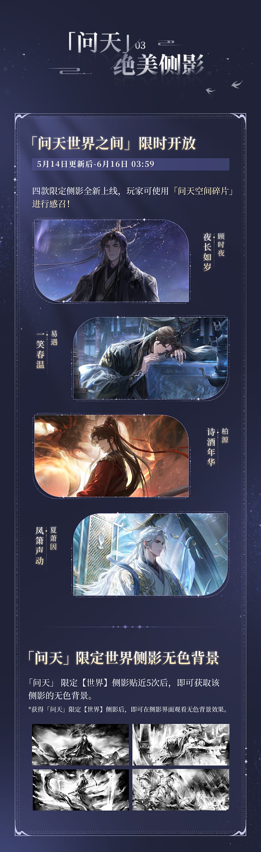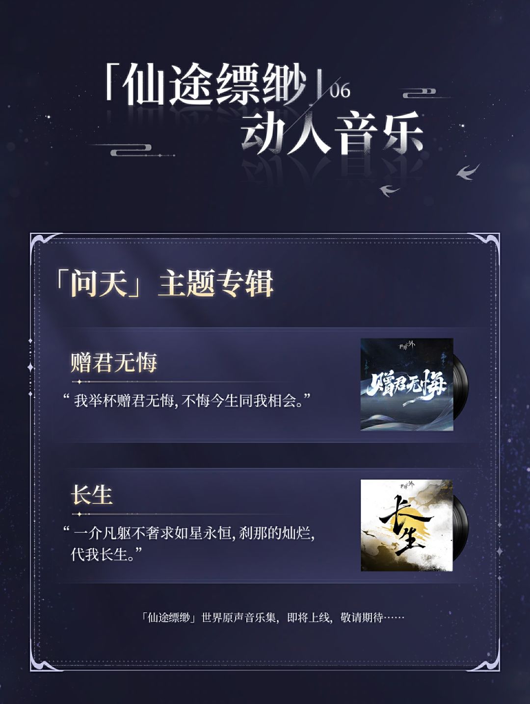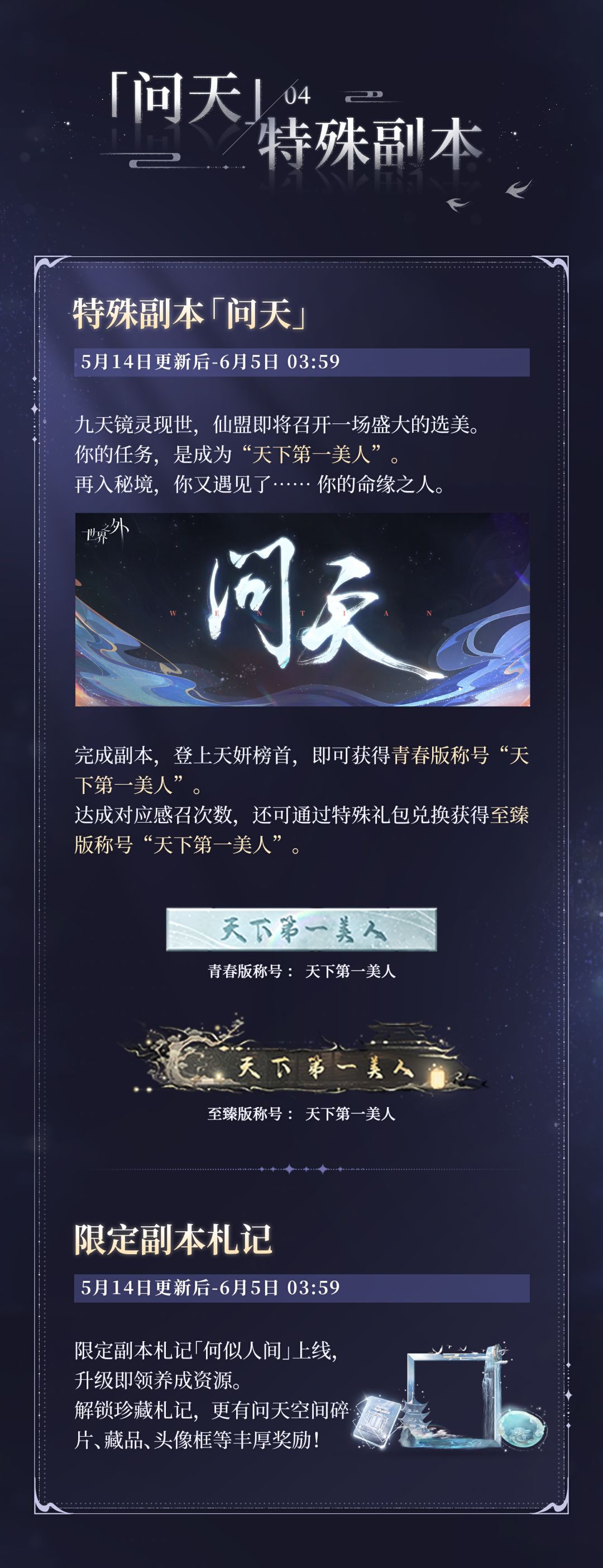 重温往昔剧情,或许会看到属于你们的前世今生。 ✦绝美侧影✦⌈问天世界之间⌋全新世界侧影,限时开放!贴近更有绝美水墨风背景,待你解锁。 ✦特殊副本✦进入⌈问天⌋秘境,成为“天下第一美人”,回应他的灵息。 ✦趣味活动✦端午佳节,百草寻踪。分拣药材,解锁时之华、红线等道具奖励! ✦动人音乐✦⌈问天⌋主题歌《赠君无悔》、《长生》现已上线! ⌈仙途缥缈⌋世界原声音乐集即将全平台上线…… “系我一生心,负你千行泪”