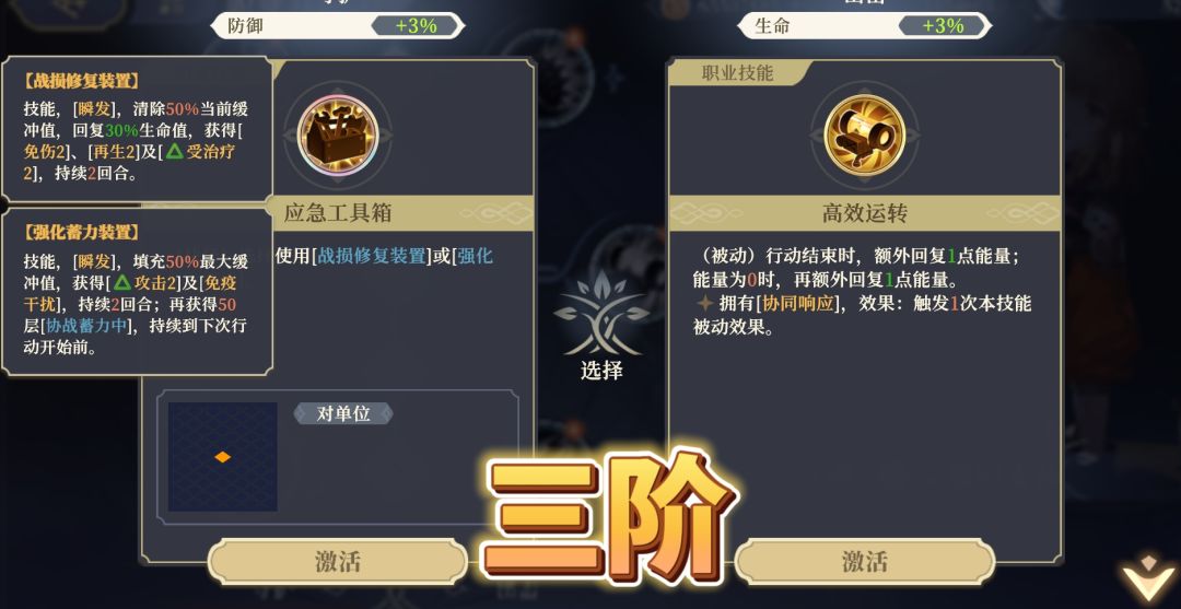 【三阶技能】左边是抉择技能,最关键的还是瞬发补充蓄力槽!右边可以说必带了!想打协同响应,5星前都会缺能量!