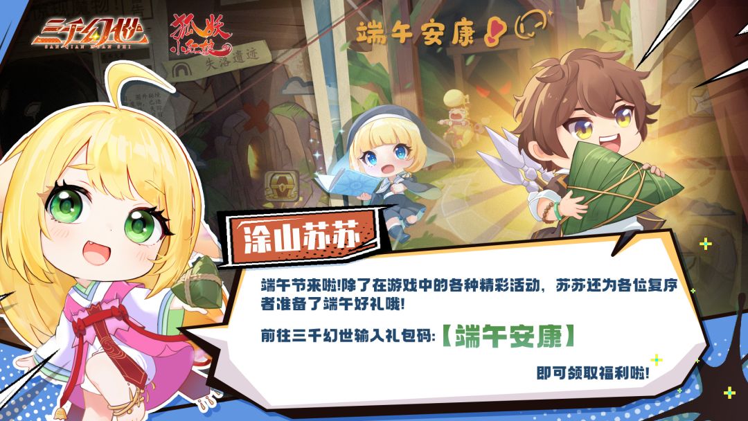 端午节来啦!除了在游戏中的各种精彩活动,三千司还为各位复序者准备了端午好礼哦!前往三千幻世输入礼包码【端午安康】,即可领取福利啦!